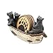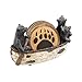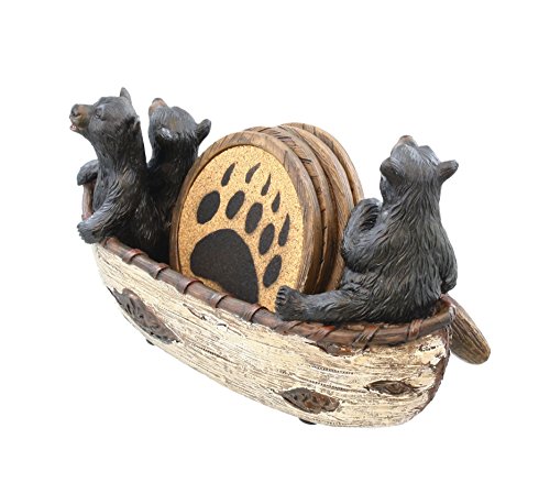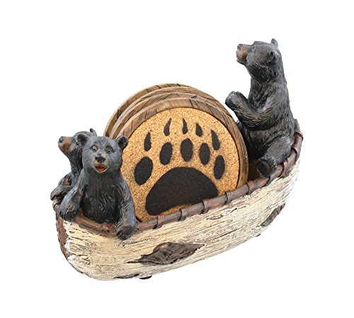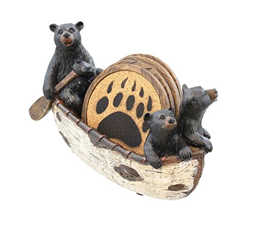 Whimsical three Black Bear Canoeing Coaster Set - (4) coasters and holder. Holder and coasters made from challenging, tough poly-resin material. The coasters are lined with cork with a bear paw picture. Holder and coasters have rubber feet. Coasters measure about 3 one/4\" diameter.