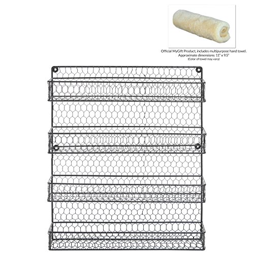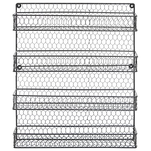 Organize your favorite spices and have them conveniently near at hand with this four tier wire wall mounted storage rack. The rack is created of metal chicken wire with a casual design and style to give a little bit of nation chic. Effortless to install by simply mounting to your cabinet, pantry door or to a wall, each and every shelf accommodates most common spice jars. Can also be employed to shop other products. Spice jars are not integrated. Official MyGift® merchandise, consists of multipurpose towel. Approximate Dimensions: 17\" W X 20.75\" H X two.25\" D.