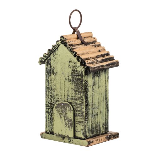 Carson Property Accents offers a assortment of rustic, unique birdhouses that are functional for indoor or outside use. This specific birdhouse is seven\" tall, has a removable clean out panel in the back, and is constructed from wood and tin.