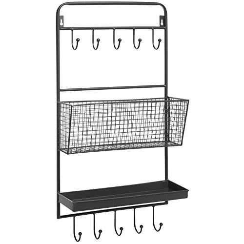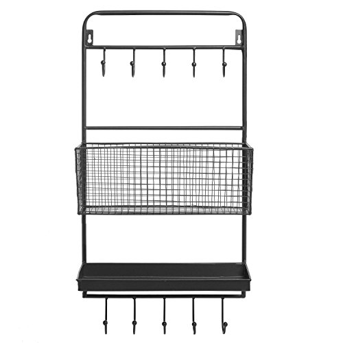Preserve your house clutter-free with this stylish wall-mounted rack. Produced of sturdy metal with a classic black finish, this storage rack boasts 10 utility hooks (five at the best, 5 on the bottom), one reliable metal shelf, and one woven metal basket to support you preserve your belongings organized and safely stored. Just attach this organizer rack to a wall in your entryway, kitchen, bathroom, bedroom, or any other room utilizing suitable mounting hardware (not incorporated) to deliver type and storage to your residence. Approximate Dimensions: 14\" W X 28\" H X five.one\" D.