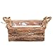 - Features a box shape with 2 thick twine handles, a natural wood finish, and a lined interior.