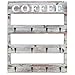 - A wall-mounted mug hook rack featuring a wooden structure with a rustic-style finish and the word COFFEE stamped in white at the top.