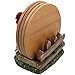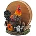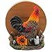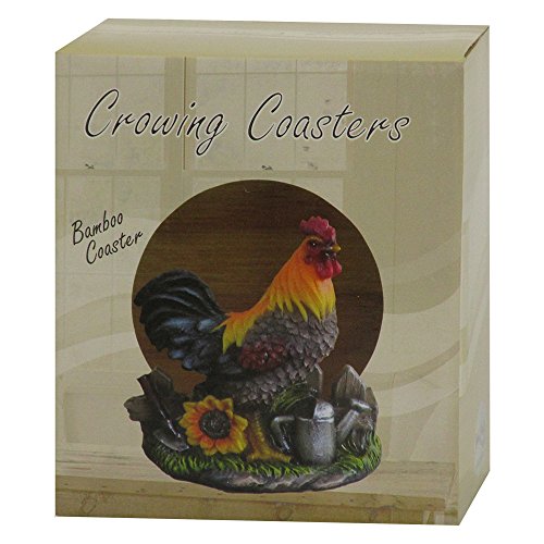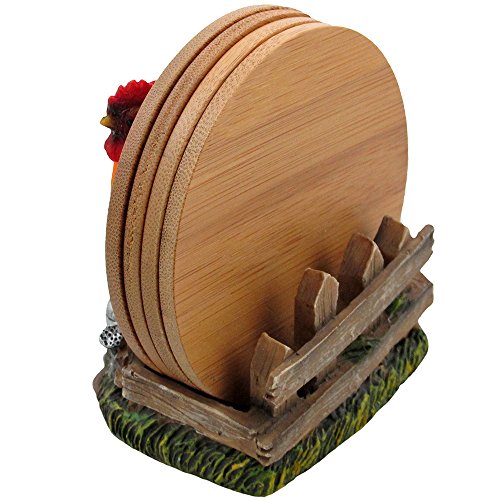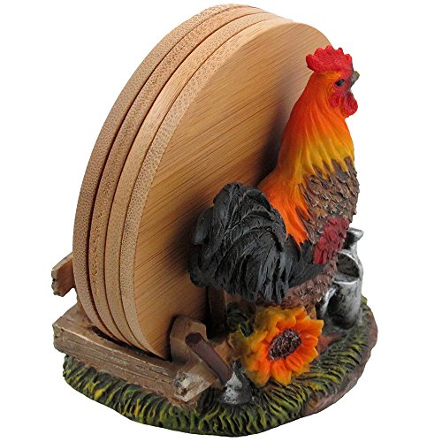 A plump, plucky rooster faithfully guards a bamboo coaster set in this wonderful farm home discover! An enchanting addition to your rustic country décor, this decorative rooster sculpture is accented with a barnyard fence, colorful sunflower and old fashioned watering pail. Can make a wonderful Christmas gift for farmers or collectors of country and rooster decorations. 5 piece set includes one rooster figurine coaster show holder and 4 three 1/two\" dia. bamboo beverage coasters.