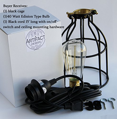 Industrial Vintage Style Curved Metal Wire Cage Pendant Ceiling Lamp Light Fixture Set with 15' Toggle Switch Black Plug-in Cord and Edison Style Bulb