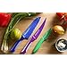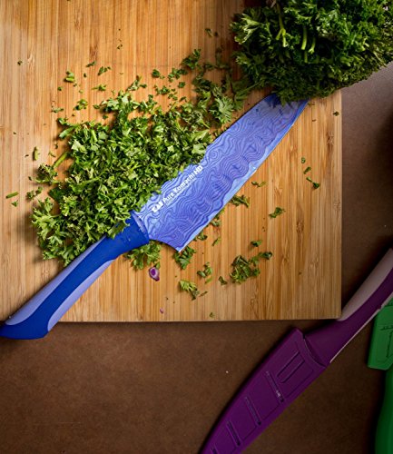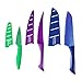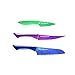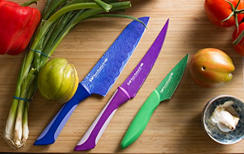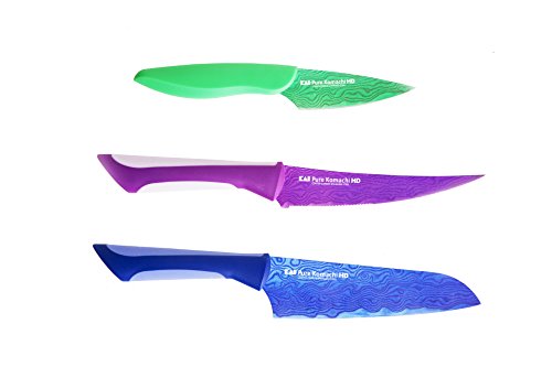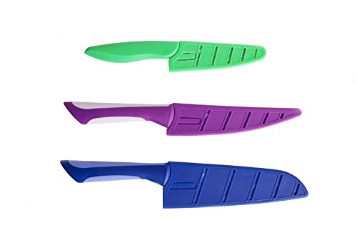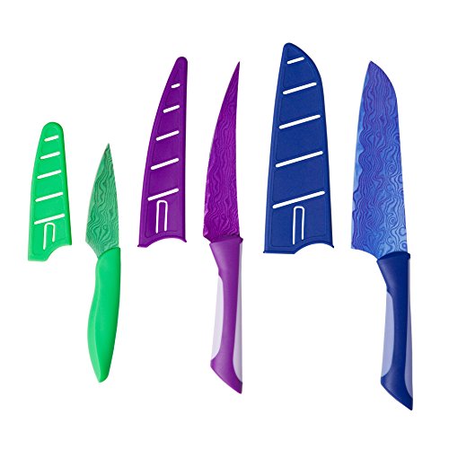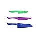 - Includes a 6.5" blue Santoku Knife, 3.5" green Paring Knife and 6" a purple semi-serrated Multi-Use