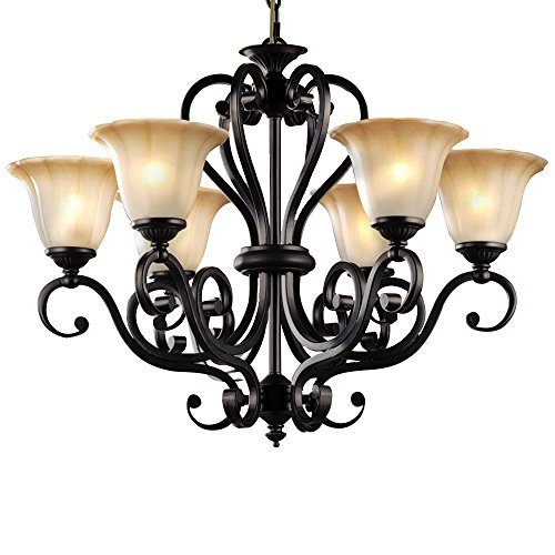 LNC Antique Finish Black Iron 6 Lights Rustic Chandelier Lighting Glass Shade D28-Inch by H22-Inch