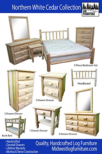 Midwest Log Furniture\'s Northern White Cedar assortment is hand selected and kiln dried to preserve the integrity of the wood. Northern White Cedar is naturally insect and weather resistant creating this a fantastic wood to finish or leave organic. Our Natural collection is rough sanded and easily finished. Approximate Log Furniture Dimensions (measurements in inches) • Dimensions & Weights will fluctuate primarily based on wood density and log variations 1 Drawer Nightstand 22Wx17.5Dx26H 2 Drawer Nightstand 22Wx17Dx24H 5 Drawer Chest 49.5Hx32Wx20D six Drawer Dresser 31.5Hx60Lx20D Coffee Table 45Lx22Wx18H Mirror 36Wx42H Rustic Bench 60Lx16Hx8-12W Approximate Furnishings Weights *Dimensions & Weights will vary based on wood density and log variations Nightstand 30 lbs five Drawer Chest 125 lbs 6 Drawer Dresser 140 lbs Coffee Table forty lbs Mirror 10lbs Rustic Bench 35lbs