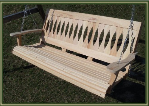 - Mission style porch swing,100% hand crafted from cypress lumber (The Eternal Wood) beautifully contoured for your sitting pleasure contoured seat for more comfort unfinished for your choice of finishing very easy assembly hanging chains included no staple. Our swings are heavily constructed with slats that are 1 inch thick and 1 3/4 inches wide routered (no sharp edges). Each slat is finish sanded on all sides and ends for your safety and comfort .