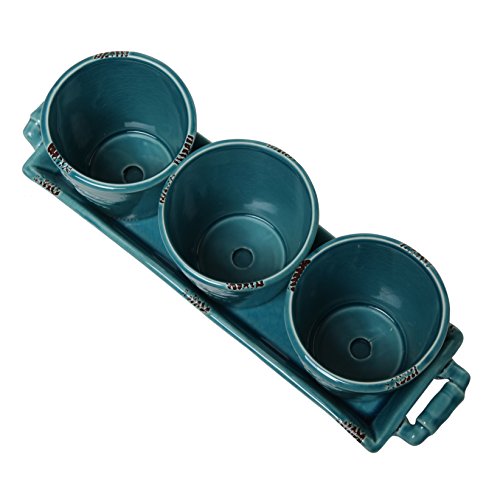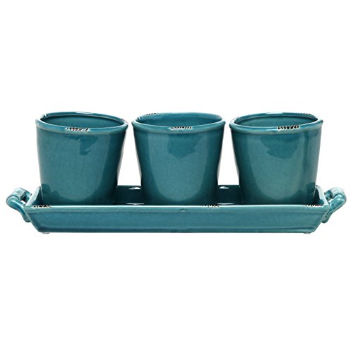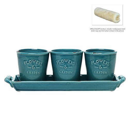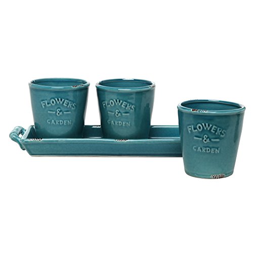 Add a dash of nation rustic design to your residence with this stunning turquoise garden planter set. Each planter pot is the best dimension for expanding your favored modest flowers, succulents or herb plants. Decorated with embossed \"Flowers & Garden\" layout, this can make a fantastic indoor or outdoor decor. With this set of planter pots displayed on your window ledge, patio or kitchen, you may be bringing the excellent blend of type and organic greenery to your space. The hole on the bottom of each pot will permit water to drain via the soil and into the display tray for optimum plant overall health.**Official MyGift® product includes multipurpose cleansing towel.** Plants not included.Approximate Dimensions: Overall - 14\" L x 4\" W x 4.75\" H. Planter Pot (each) - 4\" H x 3.75\" Diameter. Tray - 14\" L x 4\" W x one.five\" H.