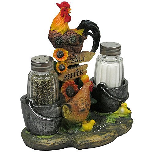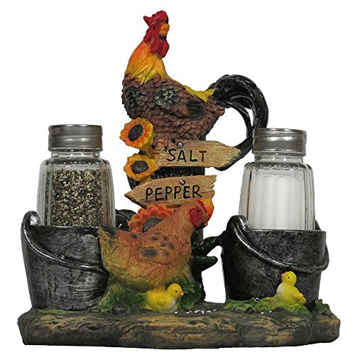 With their cute little chicks in tow, a mother hen helps make her rounds around the milk pails whilst a protective rooster stands guard. This finely detailed figurine features a pair of glass salt and pepper shakers nestled in classic stainless steel look milk pails and finished with sunflowers and rustic faux wood signs pointing to the spices. A vintage storybook picture of farm residing that will carry a bit of country design and sunshine to your kitchen décor! 3 piece set contains a single salt & pepper shaker holder and two glass s & p shakers.