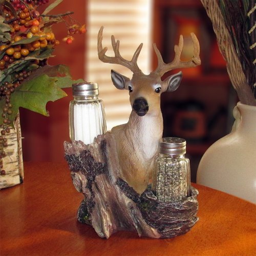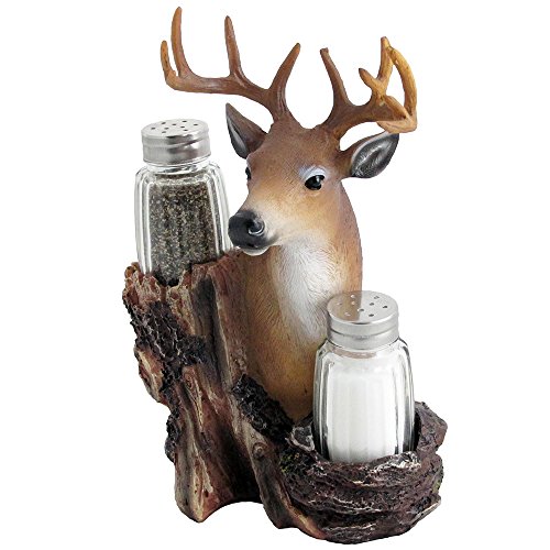 Any deer hunter or outdoorsman would appreciate this simple, however fitting, table decoration designed for a forest lodge or rustic kitchen. This ultra-realistic bust of a proud 10-stage buck supports a useful set of glass salt and pepper shakers. Spice up even the easiest meal when you serve your seasonings from this decorative shaker set with Northwoods appeal! three piece set involves two glass shakers and one decorative holder.