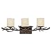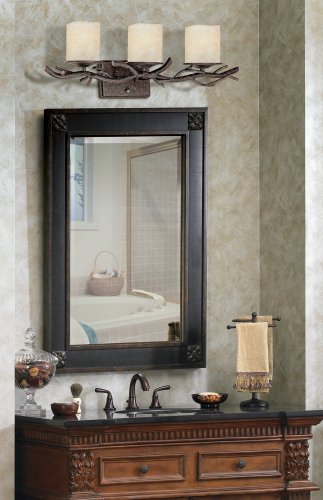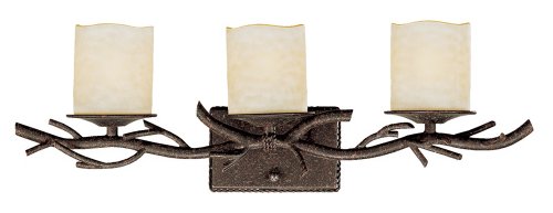 Bring a tiny rustic glamour to your bath room with this three light bath bar design and style. Branch motif comes in a dark rust finish. Cream scavo glass faux candles offers trendy lighting. 3 light design. Dark rust finish. Cream faux candle glass. Requires 3 60 watt bulbs (not integrated). 25\" wide. 7 three/4\" high. Extends 6 one/2\" from the wall. Backplate is 5\" large, 6 1/two\" wide.