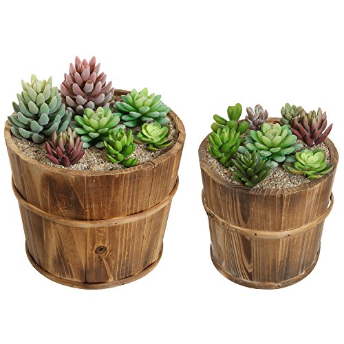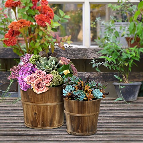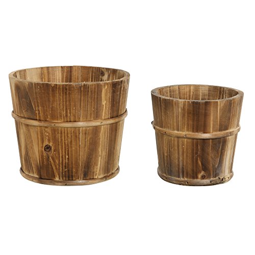- Organically complement your home decor with this set of 2 natural country rustic wood bucket-shape plant pots.