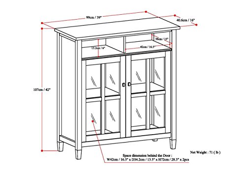 Simpli Property AXWSH005 Warm Shaker Assortment See more substantial Warm Shaker 39 inch wide Medium Storage & Media Cabinet in Honey Brown You like to be neat and tidy...which is great, so do we. It is for this purpose we created the Warm Shaker Medium Storage Cabinet. Two glass doors open to two separate storage compartments with adjustable shelves permitting you to reconfigure the layout to suit your requirements. Display your fine china, decorative accents or even motion pictures on focused show space for a clean, distinctive search. This piece can also be utilized as a Tv Stand and the two open spaces supply extra storage for media and gaming units. The Warm Shaker Look The Warm Shaker Search combines the warmth of a nation house with the relaxed really feel of a informal rustic style. The fashion is defined by its Honey Brown finish, shaker style glass panel doors, Brushed Nickel knobs and tapered legs. The assortment is produced from sound plantation grown pine and is finished with a durable NC lacquer best coat. The Warm Shaker Assortment If you adore the seem of your new Medium Storage & Media Cabinet, we have much more items in the Warm Shaker Collection to total your space. These pieces incorporate: the Warm Shaker Coffee Table, End Table, Tall Television Stand and Entryway Bench. Check out our Simpli Property Brand Page to view them all. See more substantial Functional Storage Answer The Warm Shaker Medium Storage & Media Cabinet features two adjustable shelves allowing you to configure your space to suit your needs. The two open storage areas offer room for media and gaming gadgets. See larger Honey Brown Finish Get pleasure from the warmth of the Honey Brown Finish. Sealed with a premium NC Lacquer Coating. View bigger Nation Residence Rustic Styling The Warm Shaker Medium Storage was created to be cozy and relaxed. It has rustic styling that reminds you of a nation residence. It blends effortlessly in most kitchen, residing and household area settings. With its traditional lines and rustic seem, the Warm Shaker collection is a sensible decision for your property furnishing wants. View larger Shaker Type Doors with Tapered Legs The styling of the Warm Shaker Collection doors, legs and top information blend properly to develop a harmonious search. See more substantial Brushed Nickel Hardware Brushed Nickel knobs accent and enhance the all round search of the collection. View more substantial Perfectly Sized This beautiful and versatile piece is large ample to suit your wants but modest ample to fit effortlessly in your space.