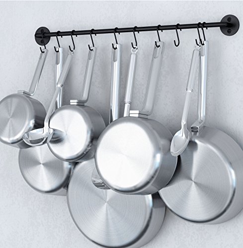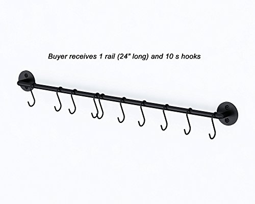 Steel Gourmet Kitchen 24 Inch Wall Rail and 10 S Hooks Set Utensil Pot Pan Lid Rack Storage Organizer Black Color