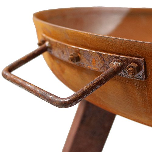 - Fire pit is made from durable, heavy duty cast iron material that is oxidized for a rustic look.