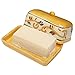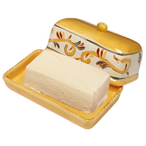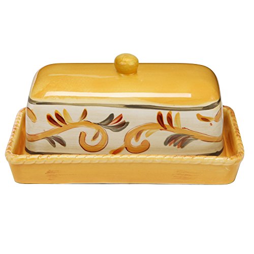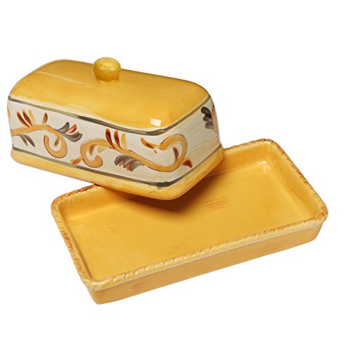 - Beautiful ceramic butter dish with a country rustic yellow finish and a Tuscan floral design.