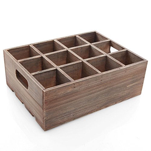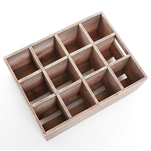 - Boasts 12 divided slots and a vintage finish on the wood surface.