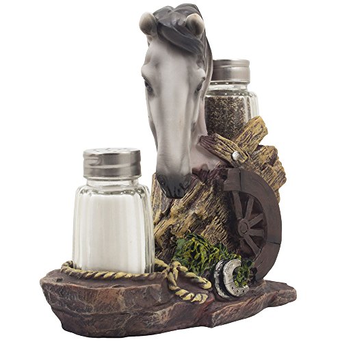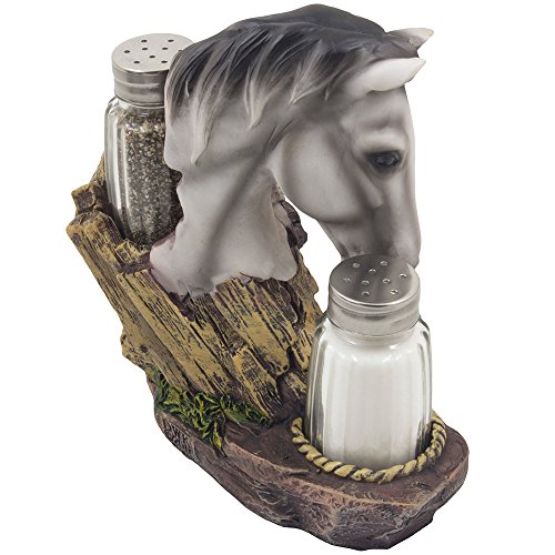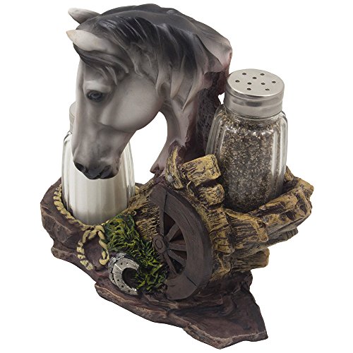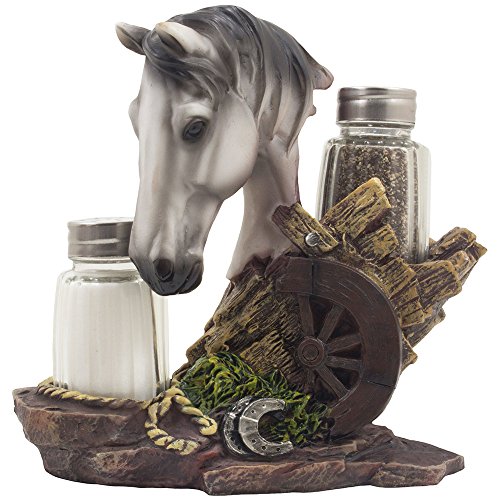 Spice up your following feast in rustic country western flair with this extraordinary white stallion salt and pepper shaker set! This meticulously hand-crafted sculpture not only helps make a stunning dining room table decoration, but it also serves as a practical spice rack. A great present for pony and horse lovers or for collectors of ranch and farm themed kitchen décor. 3 piece set includes one particular decorative horse figurine with rustic wagon wheel, rope and horseshoe accents as the display stand, and a pair of glass salt & pepper shakers.